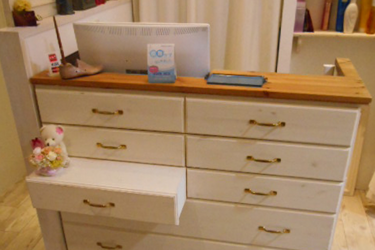 ![]() ▲ 一見チェストに見えますが、私が製作したレジカウンターです。フィンランドの無垢パインで製作したオリジナルで69,800円です。 |